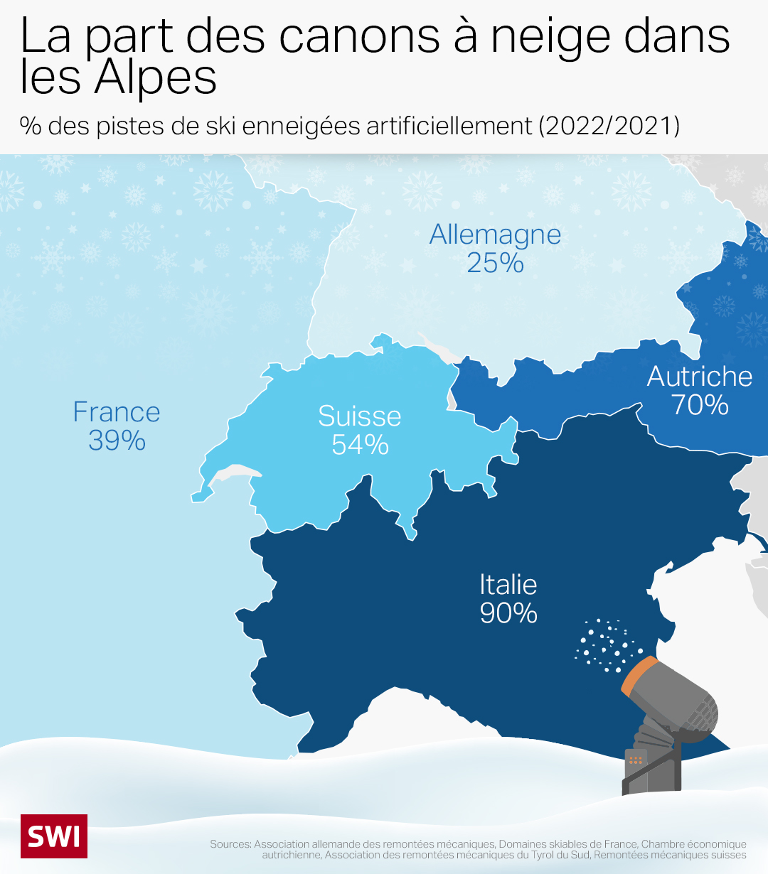 Remontées mécaniques suisses fait également valoir que sans canons à neige, il n’y aurait pas de pistes. Ils assurent une première couche de neige avant Noël et contribuent ainsi aux quelque 5 milliards de francs que génère chaque année le tourisme d’hiver en Suisse.