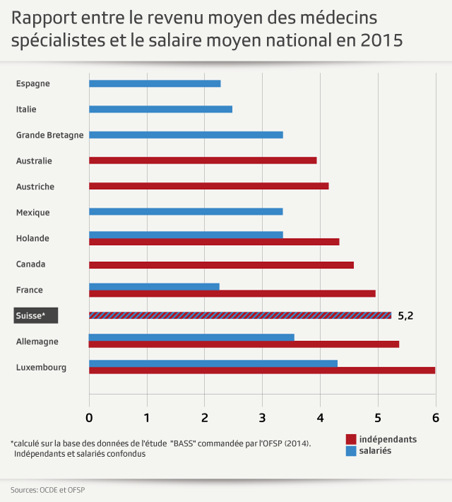 Ce dernier montre également que de manière générale le revenu moyen des médecins est nettement supérieur au salaire national moyen. Si l’on compare le revenu moyen des médecins de la Confédération, calculé par l’étude mandatée par l’OFSP, avec le salaire national moyen, il apparaît que les médecins suisses figurent parmi les mieux payés. Le revenu moyen des spécialistes (indépendants et salariés confondus) équivaut à 5,2 fois le salaire moyen helvétique de la même année. Ce ratio est de 3,8 pour les médecins généralistes. Seule l’Allemagne et le Luxembourg ont des ratios plus élevés.