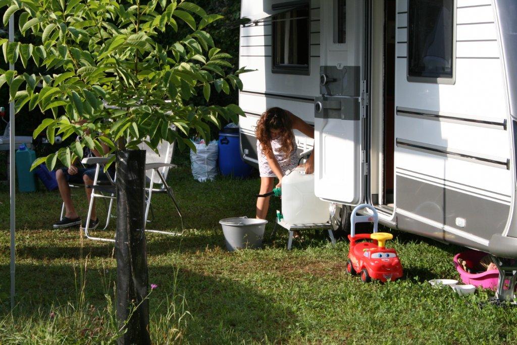 Une demi-douzaine de caravanes sont parquées, un mobile-home et plusieurs voitures. Un chien aboie. La literie prend l’air, la lessive le soleil, il y a des jouets çà et là. Une table et des chaises sont disposées devant chaque convoi. Il y a de gros bidons d’eau: la rivière est tout près, mais il n’y a pas d’eau potable. Il n’y a pas de conteneur à poubelles non plus.