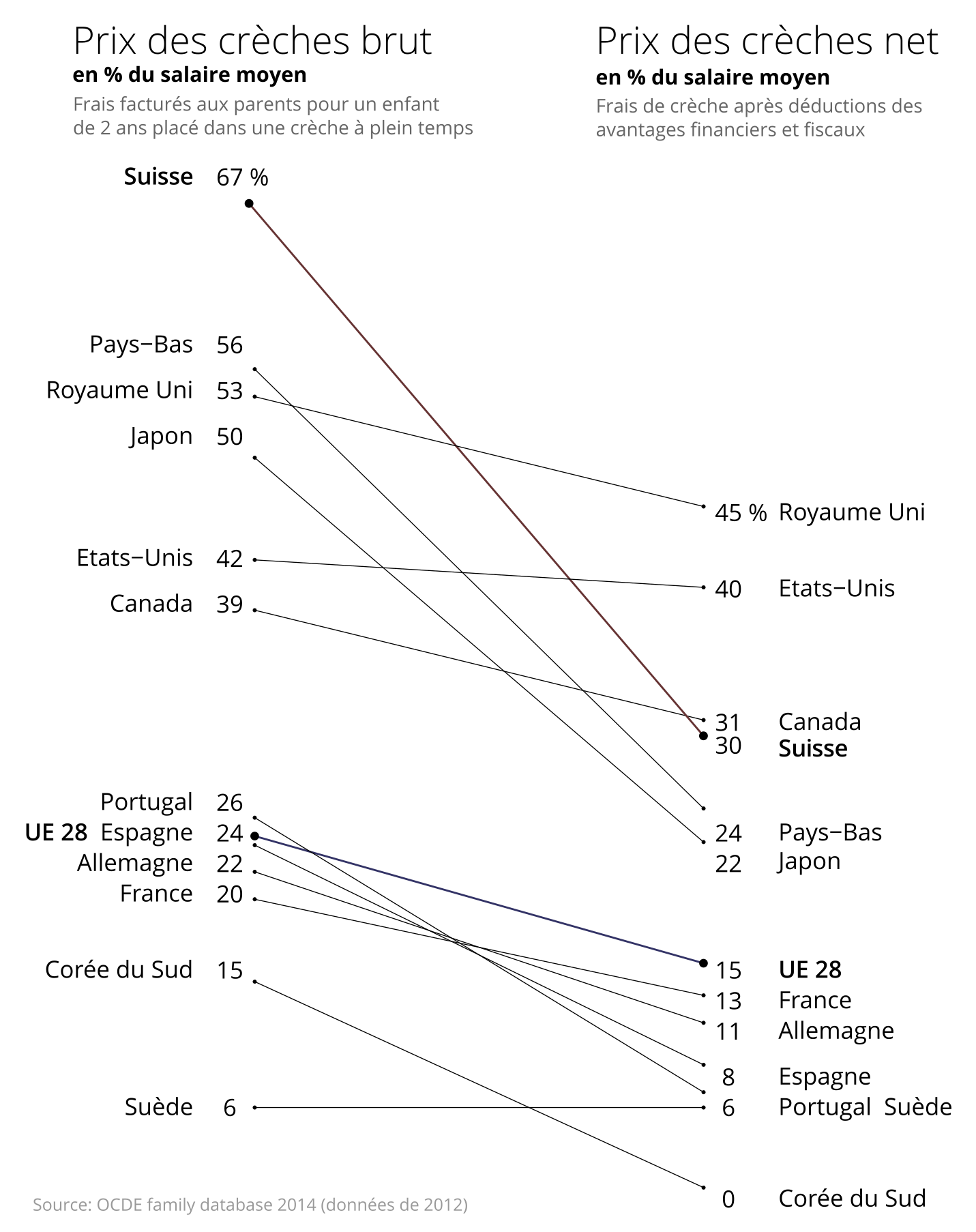 Ce sentiment est confirmé par les études internationales. Avec une facture qui s’élève à deux tiers du salaire moyen pour une place de crèche à plein temps, la Suisse se hisse largement en tête des pays de l’OCDE en matière de coûts dévolus à l’accueil extra-familial.