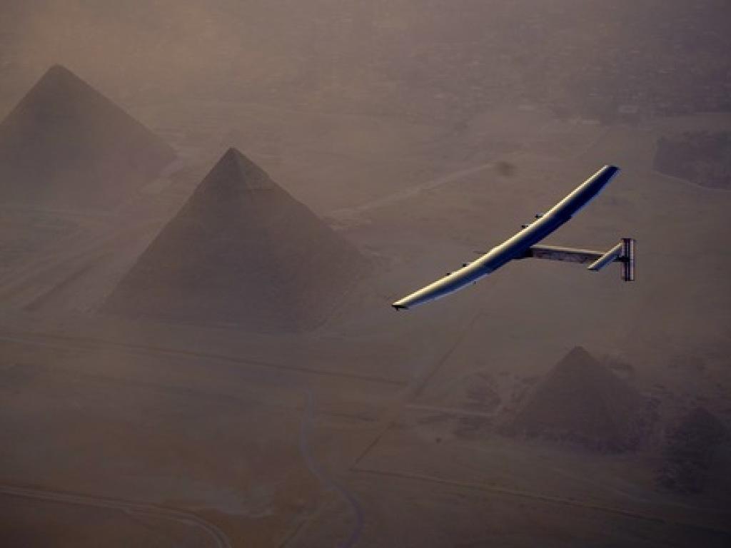 Solar Impulse 2 est arrivé au Caire le 13 juillet, après avoir survolé les pyramides de Guizeh et le Sphinx (archives). Keystone/AP Solar Impulse/JEAN REVILLARD / REZO sda-ats