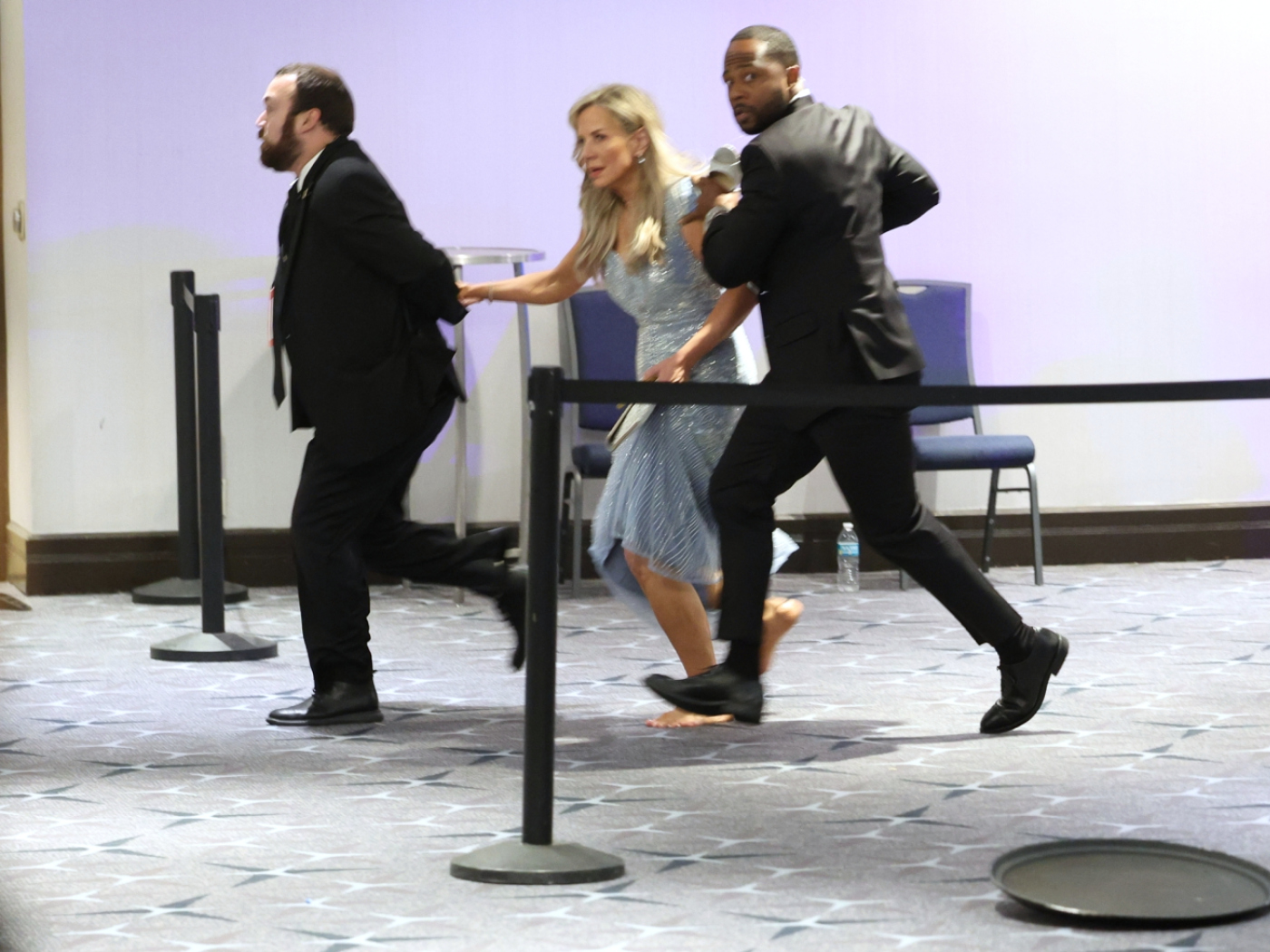Des agents de sécurité lourdement armés interviennent alors très rapidement et évacuent le président vers la gauche de l’estrade. La musique d’ambiance s’arrête alors que d’autres gardes enjambent la table et semblent tenir en joue le public.