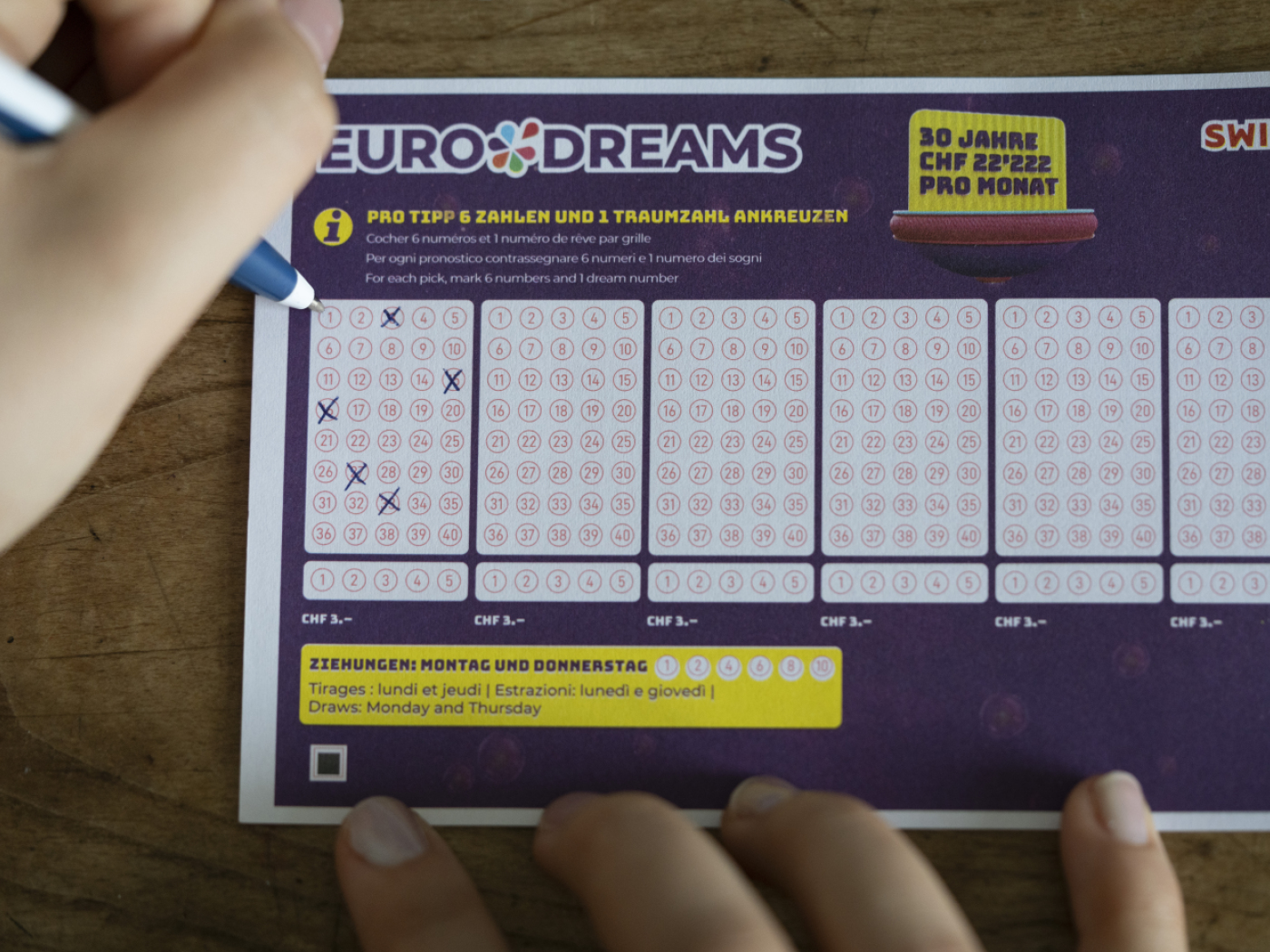 Personne n’a trouvé la combinaison gagnante à l’Eurodreams jeudi soir. Pour gagner une rente mensuelle de 22’222 francs durant 30 ans, il fallait jouer les six numéros 1, 7, 8, 26, 28 et 34, ainsi que le numéro «dream» 5, a indiqué la Loterie romande.