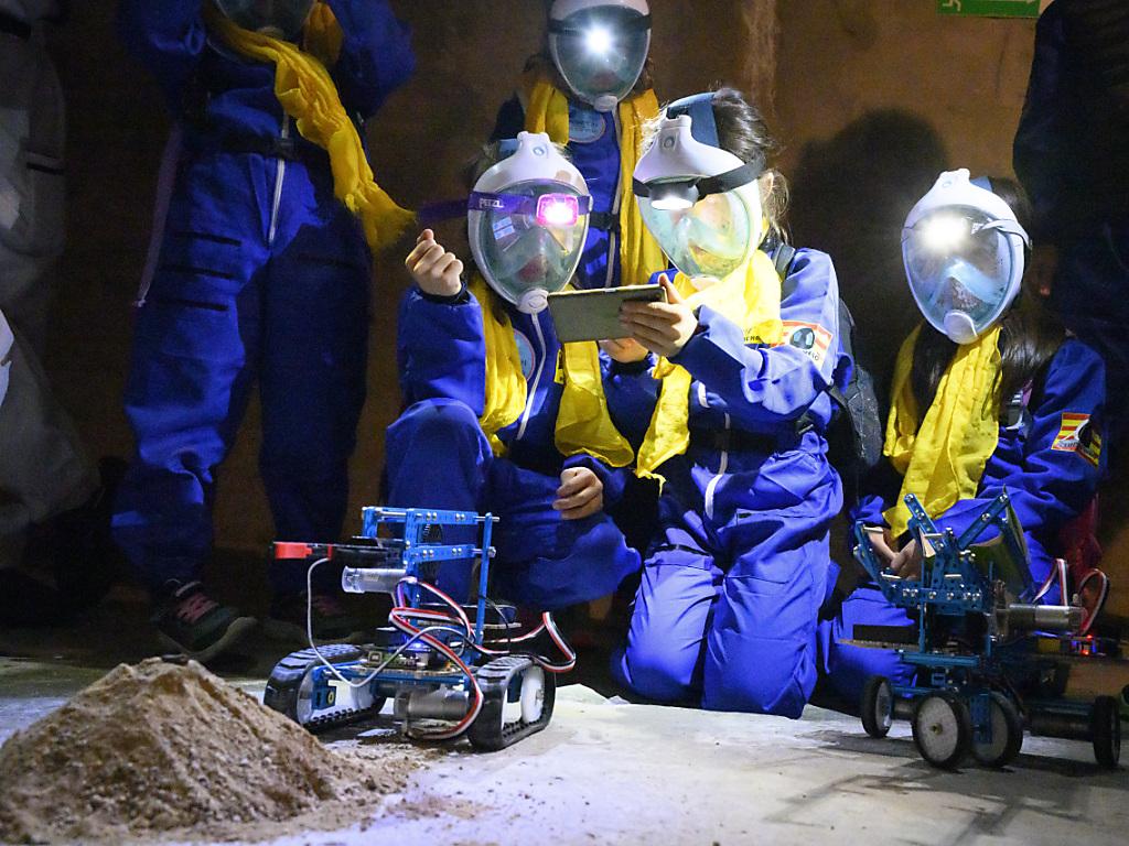 Ils sont une quinzaine d’enfants, âgés de huit ans et vêtus de combinaisons spatiales pour l’occasion, à se déplacer dans les 600 mètres de galeries creusées dans la montagne. Durant trois jours, soit jusqu’à vendredi, ils mangent des aliments lyophilisés et font de leur mieux pour mener à bien cette mission Petit Prince qu’ils préparent depuis neuf mois.