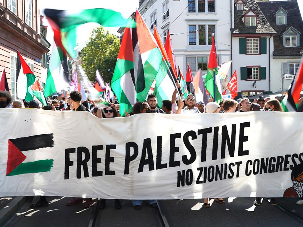 Environ 300 personnes se sont rassemblées dimanche vers 15 heures à proximité de la gare CFF. Les participants portaient le drapeau palestinien et certains des maillots avec l’inscription «Boycott Israël». Sur les banderoles, on pouvait lire «Free Palestine – No Zionist Congress».