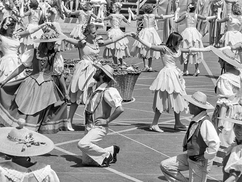 L'origine de la Fête des Vignerons se perd dans la nuit des temps. Mais c'est en 1797 qu'elle prit véritablement forme à Vevey. Entre 4 à 5 fois par siècle, la ville de la Riviera vibre au rythme de la manifestation, comme ici en 1977 (archives). KEYSTONE/STR sda-ats