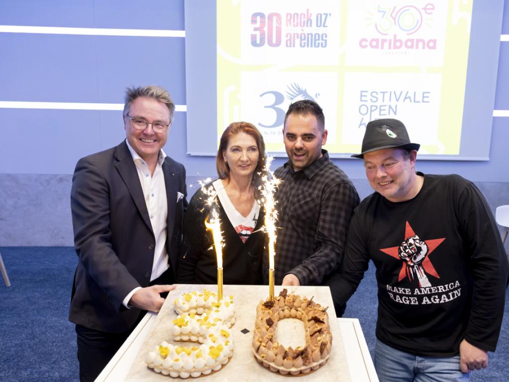 De gauche à droite: Tony Lerch, directeur du Caribana, Charlotte Carrel, directrice artistique de Rock Oz'Arenes, Nicolas Bally, directeur d'Estivale Open Air, et Gilles Pierre, directeur du Chant du Gros, célèbrent les 30e éditions de leurs festivals respectifs. Keystone/SALVATORE DI NOLFI sda-ats