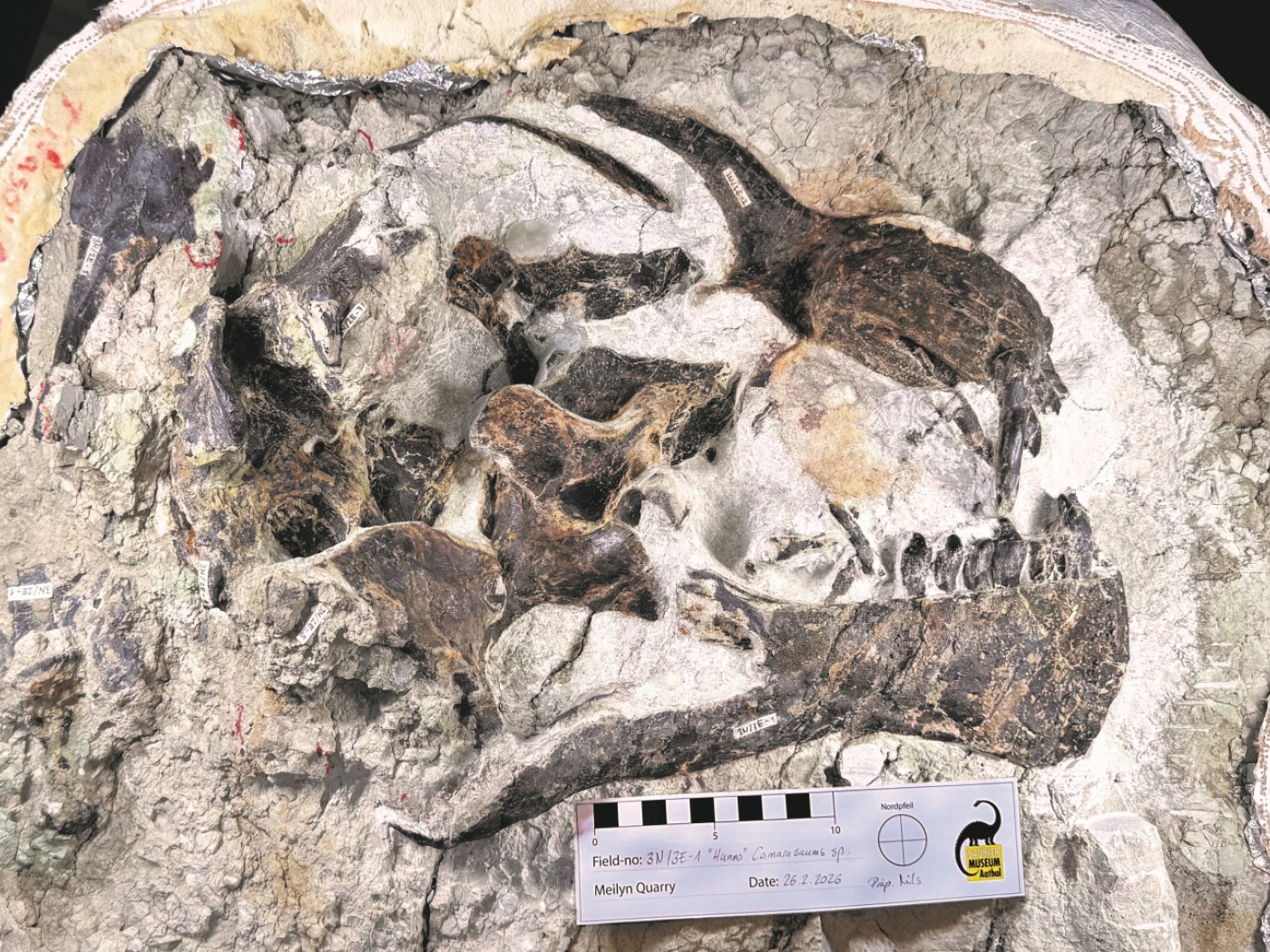 A côté des fragments, l’éclat caractéristique de dents en forme de pelle a permis d’identifier l’espèce Camasaurus, un dinosaure herbivore à long cou. Lors des travaux de préparation qui ont suivi, les chercheurs ont constaté à quel point le crâne était particulièrement bien conservé.