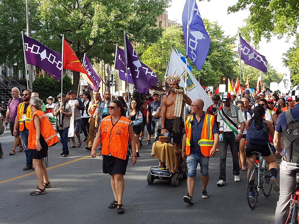 Le défilé s’est ébranlé en fin d’après-midi, sous le soleil. Symboliquement, le cortège était conduit par des représentants des peuples autochtones du Canada, au son des tambours et des chants traditionnels.