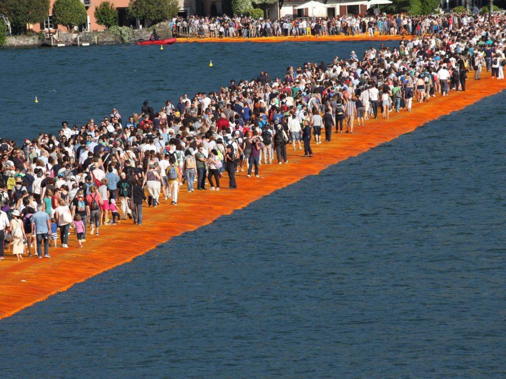 Célèbre pour ses oeuvres monumentales, l’artiste Christo a dessiné sur le lac des passerelles flottantes («The Floating Piers»), recouvertes d’un tissu jaune-dahlia. L’oeuvre, ouverte au public depuis samedi, devait être accessible de jour comme de nuit jusqu’au 3 juillet, mais l’afflux de visiteurs pourrait changer la donne.