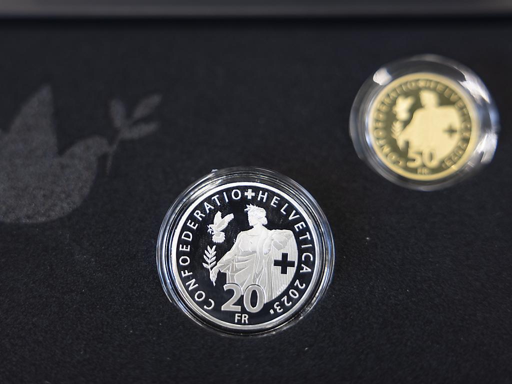 Deux anges portant les armoiries suisses figurent sur le revers de la pièce. KEYSTONE/PETER KLAUNZER sda-ats