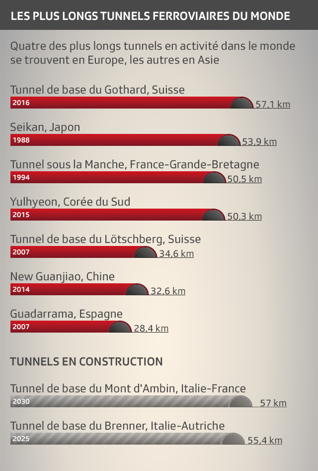 L’illustration suivante montre les plus longs tunnels ferroviaires du monde au moment de l’ouverture du tunnel de base du Saint-Gothard. Depuis, le tunnel du lac Songshan en Chine (38,8 km) et le tunnel entre Shenzhen et Hong Kong (35,7 km) ont été construits.
