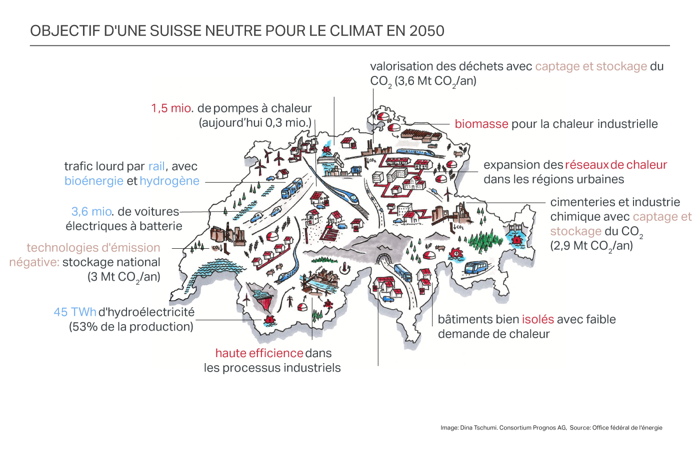 Les émissions de CO2 générées par les transports, le chauffage, le refroidissement des bâtiments et l’industrie pourront être réduites jusqu’à 95% grâce aux technologies actuelles et à l’utilisation d’énergies renouvelables, assure la ConfédérationLien externe. Il sera également possible de réduire l’utilisation d’autres gaz à effet de serre, en particulier dans l’agriculture. La compensation des émissions restantes sera assurée par les puits naturels de CO2, comme les forêts et les sols, ainsi que par des technologies capables de retirer des gaz à effet de serre de l’atmosphère ou de les capturer directement là où ils sont produits, par exemple dans les usines d’incinération, pour ensuite les stocker durablement.