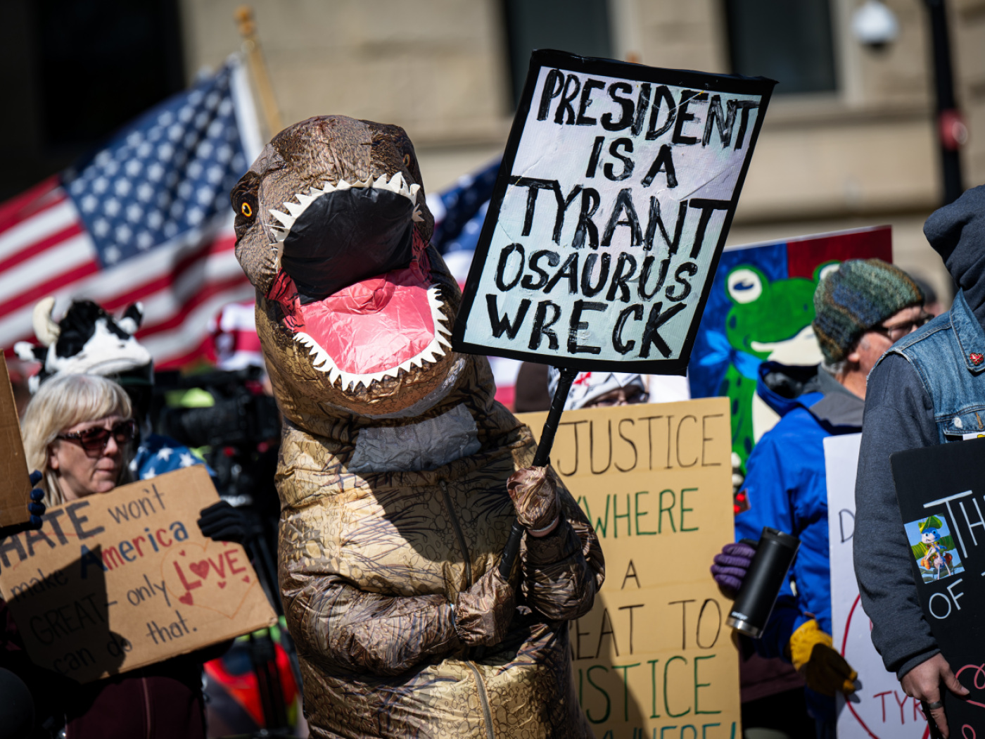 Auch im wohlhabenden Umland der Hauptstadt versammelten sich zahlreiche Demonstrierende. In Bethesda im Bundesstaat Maryland standen sie mit Schildern, Wimpeln und Postern entlang der Connecticut Avenue. Autofahrer hupten zustimmend. Eine Frau in einem Hahnenkostüm hielt ein Schild mit der Aufschrift «Wir brauchen keine royalen Dekrete» – wohl als Anspielung auf die zahlreichen Anordnungen, mit denen Trump seine Politik durchsetzen will.