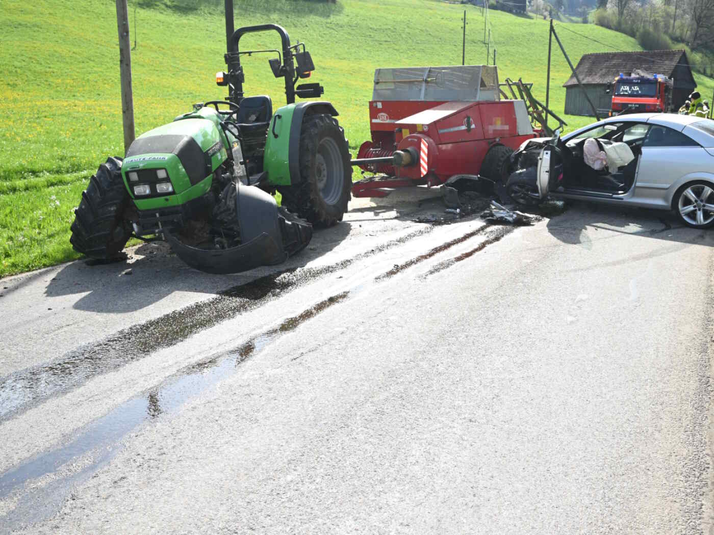 Ein Auto ist am Samstagmorgen in Mogelsberg SG frontal mit einem Traktor kollidiert. Der 21-jährige Autofahrer war am Steuer eingeschlafen und auf die Gegenfahrbahn geraten.