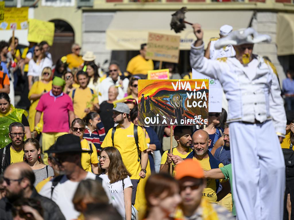 Mit Musik und begleitet von Artisten auf Stelzen startete die Parade gegen 13.00 Uhr vom Domplatz und zog zum Europaplatz der Waadtländer Hauptstadt. Die Farbe der Manifestation – Gelb – war überall zu sehen. «Kognitiv divergierend, aber mit offenen Armen», war auf einem Transparent zu lesen.