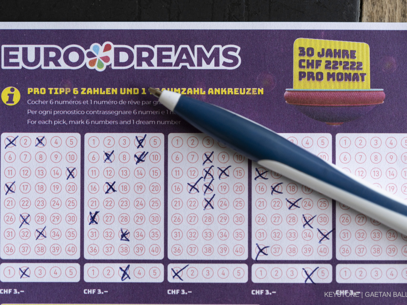 Der Hauptgewinn besteht in einer monatlichen Zahlung von 22’222 Franken während 30 Jahren. Um diesen zu gewinnen, müssen die sechs richtigen Zahlen sowie die Traumzahl richtig sein. Die Ziehungen finden jeweils am Montag und Donnerstag statt.