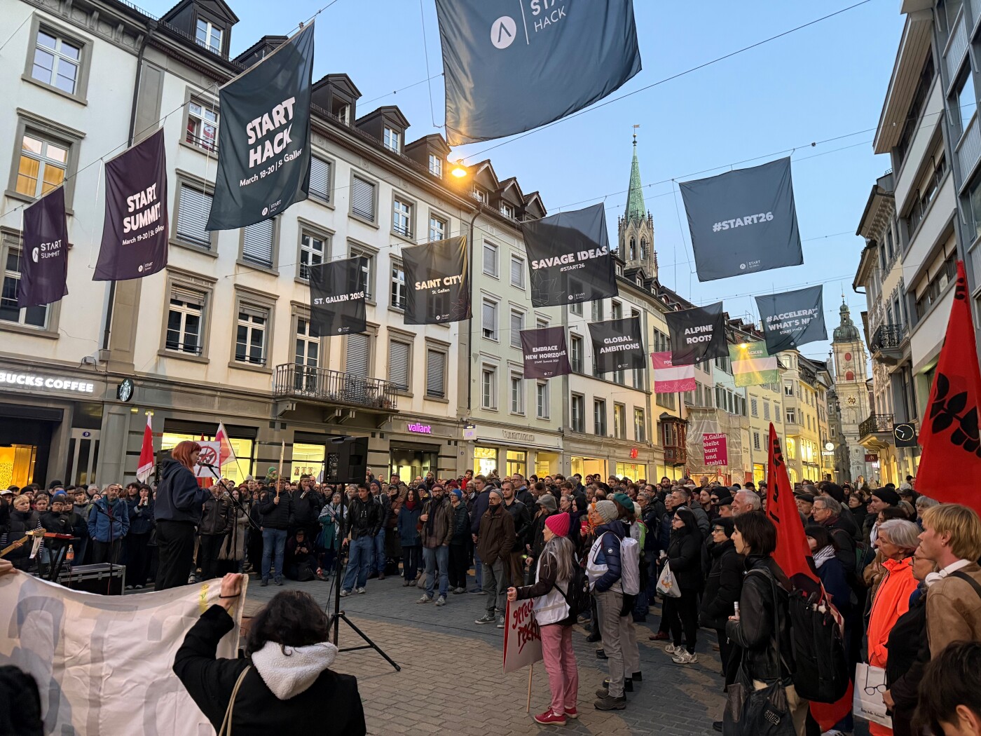 Auf Plakaten waren durchgestrichene Hellebarden sowie Slogans wie «St. Gallen bleibt bunt und stabil» oder «St. Gallen gegen rechts» zu sehen. Die Kundgebung verlief friedlich.