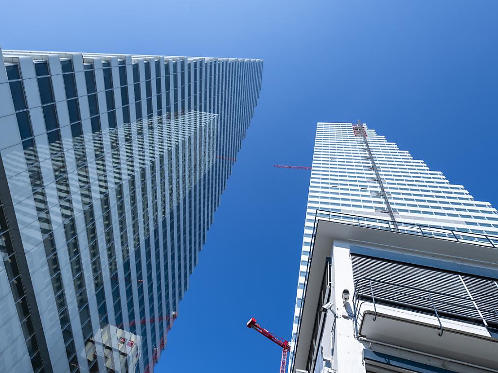 Oben angekommen, kann man einen Blick bis weit in den Schwarzwald, in die elsässischen Belchen und die schweizerischen Jura-Ausläufer werfen. Und hinunter aufs Dach des benachbarten Baus 1, der mit seinen 178 Metern nur noch für ein Jahr das höchste genutzte Gebäude des Landes sein wird.