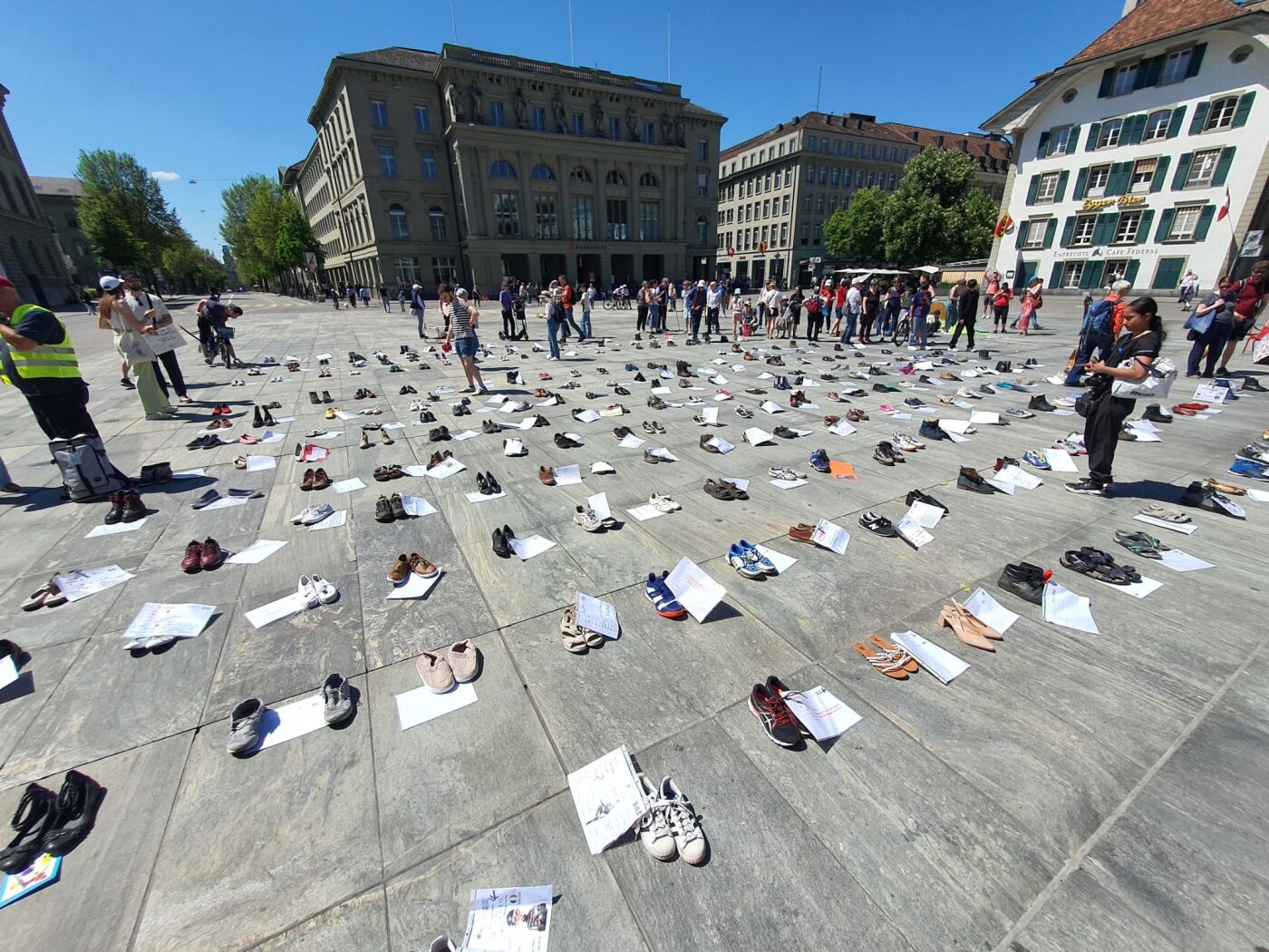 Die Demonstrierenden stellten stellvertretend für die Erkrankten 300 Paar Schuhe auf den Bundesplatz. Die Betroffenen seien zu schwach, um selbst an der Kundgebung teilzunehmen, schrieb die Patientenorganisation ME/CFS Schweiz. Die Not sei gross unter ihnen.