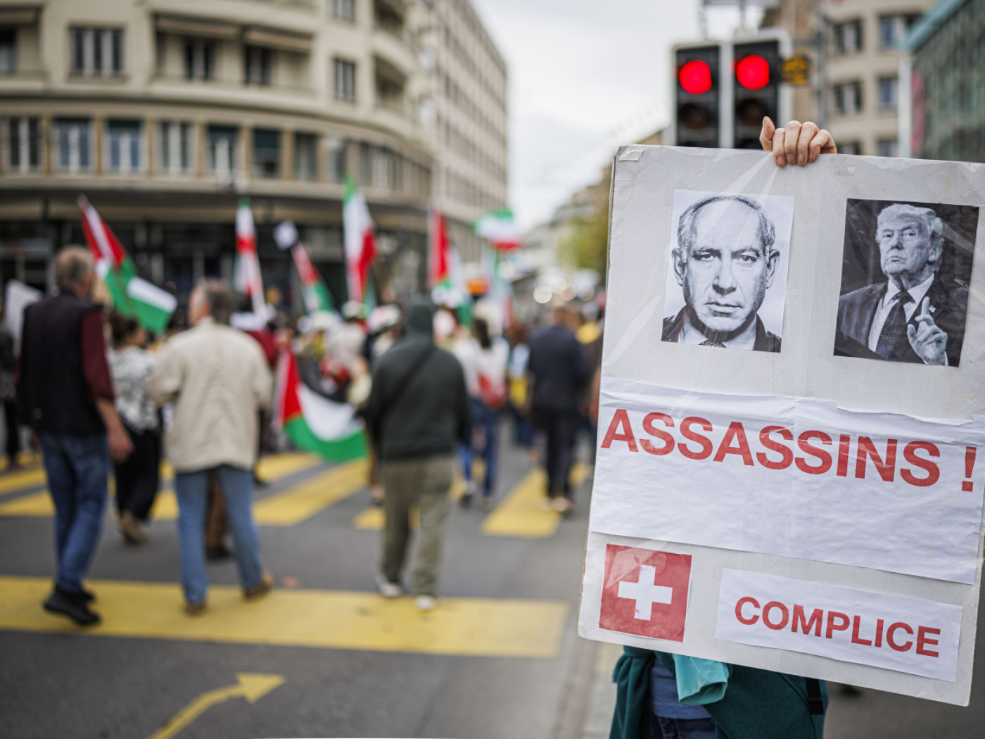 Auf einem Schild wurden US-Präsident Donald Trump und der israelische Ministerpräsident Benjamin Netanjahu als Mörder bezeichnet – und die Schweiz als Komplizin.