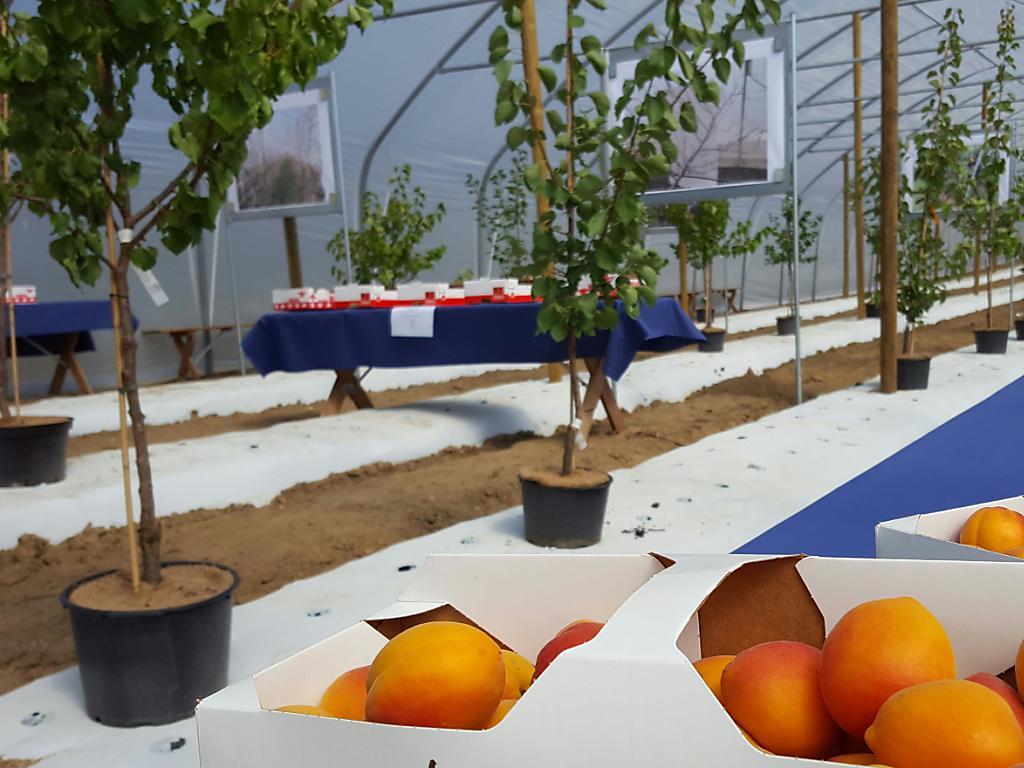 Die dauerhaften Folientunnel schützen die sensiblen Aprikosenbäume vor allem während der Blütezeit vor Schädlingen und Pilzbefall. In jedem der Tunnel werden mehrere verschiedene Aprikosensorten gepflanzt.