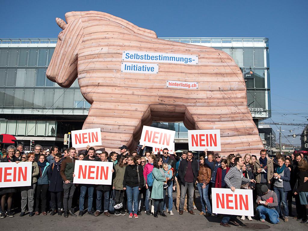 (Keystone-SDA) Mit einer Aktion auf dem Bundesplatz hat die Allianz der Zivilgesellschaft auf die negativen Seiten der SVP-Selbstbestimmungsinitiative (SBI) aufmerksam gemacht. Die Allianz bezeichnet die Initiative als «trojanisches Pferd für Demokratie und Menschenrechte».