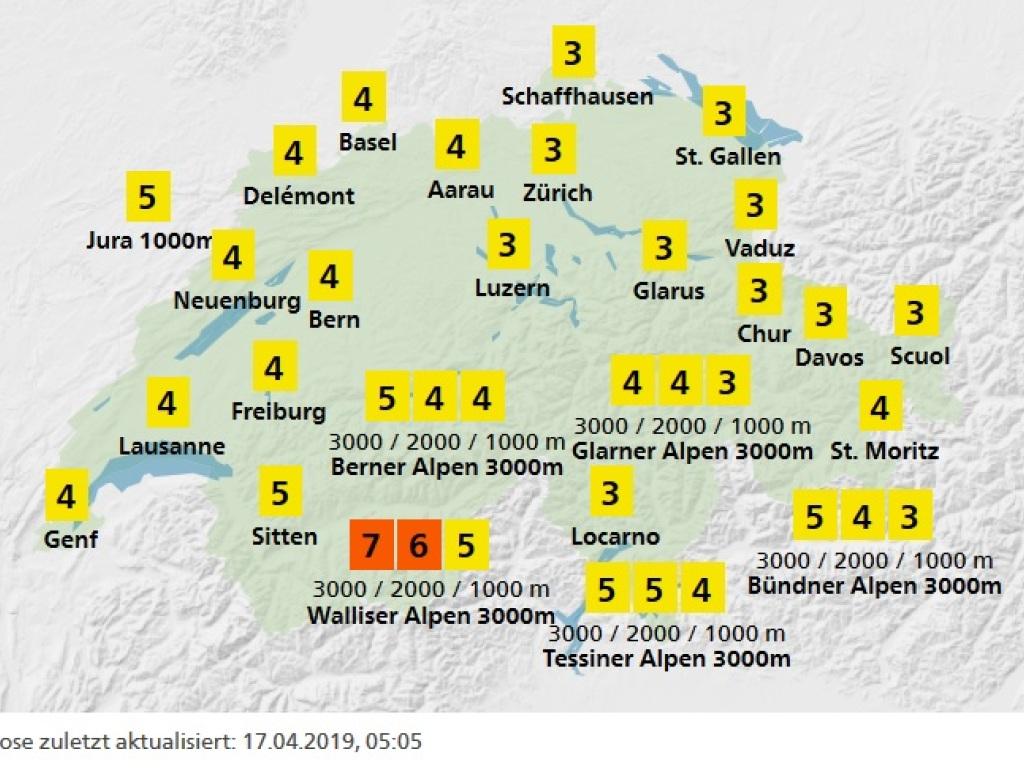 Auskunft gibt der UV-Index von MeteoSchweiz, https://www.meteoschweiz.admin.ch/home.html?tab=uvindex. Je höher die Zahl des UV-Indexes, der zwischen eins und elf angegeben wird, desto höher die Strahlung und damit auch die Sonnenbrandgefahr. Bereits ab UV-Index drei ist ein Schutz erforderlich, zum Beispiel durch bedeckende Kleidung oder Sonnencreme. Ab einem Wert von sechs sind Schutzmassnahmen unbedingt erforderlich, ab Stufe acht wird vom Aufenthalt im Freien abgeraten. Auf dem Wasser und am Strand ist die Strahlenbelastung oft besonders hoch.