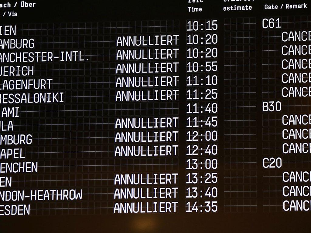 Am Flughafen Zürich waren am Dienstagnachmittag sechs Lufthansa-Flüge zum internationalen Drehkreuz Frankfurt als annulliert registriert. In Genf-Cointrin informierte der Flugplan über vier gestrichene Verbindungen dorthin.
