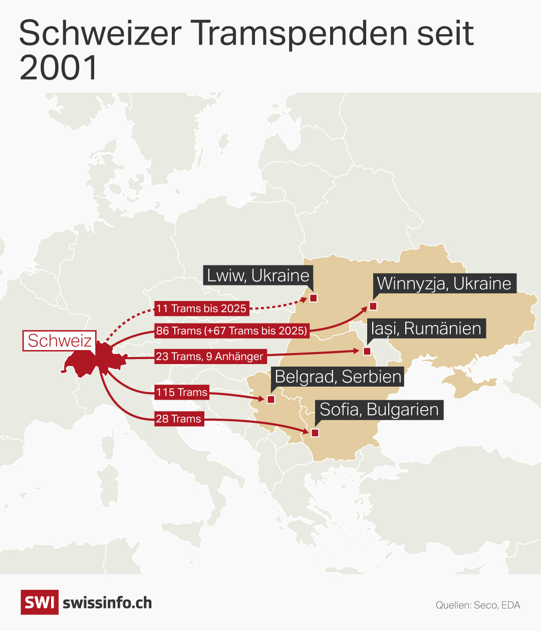 «Unseres Wissens ist die Schweiz das einzige Land, das bisher [solch] umfangreiche Projekte für den Transfer von gebrauchten Trams finanziert hat», sagt Graf. Das Seco übernimmt die gesamten Kosten für die Spende in Lwiw in Höhe von 1,8 Millionen Franken.