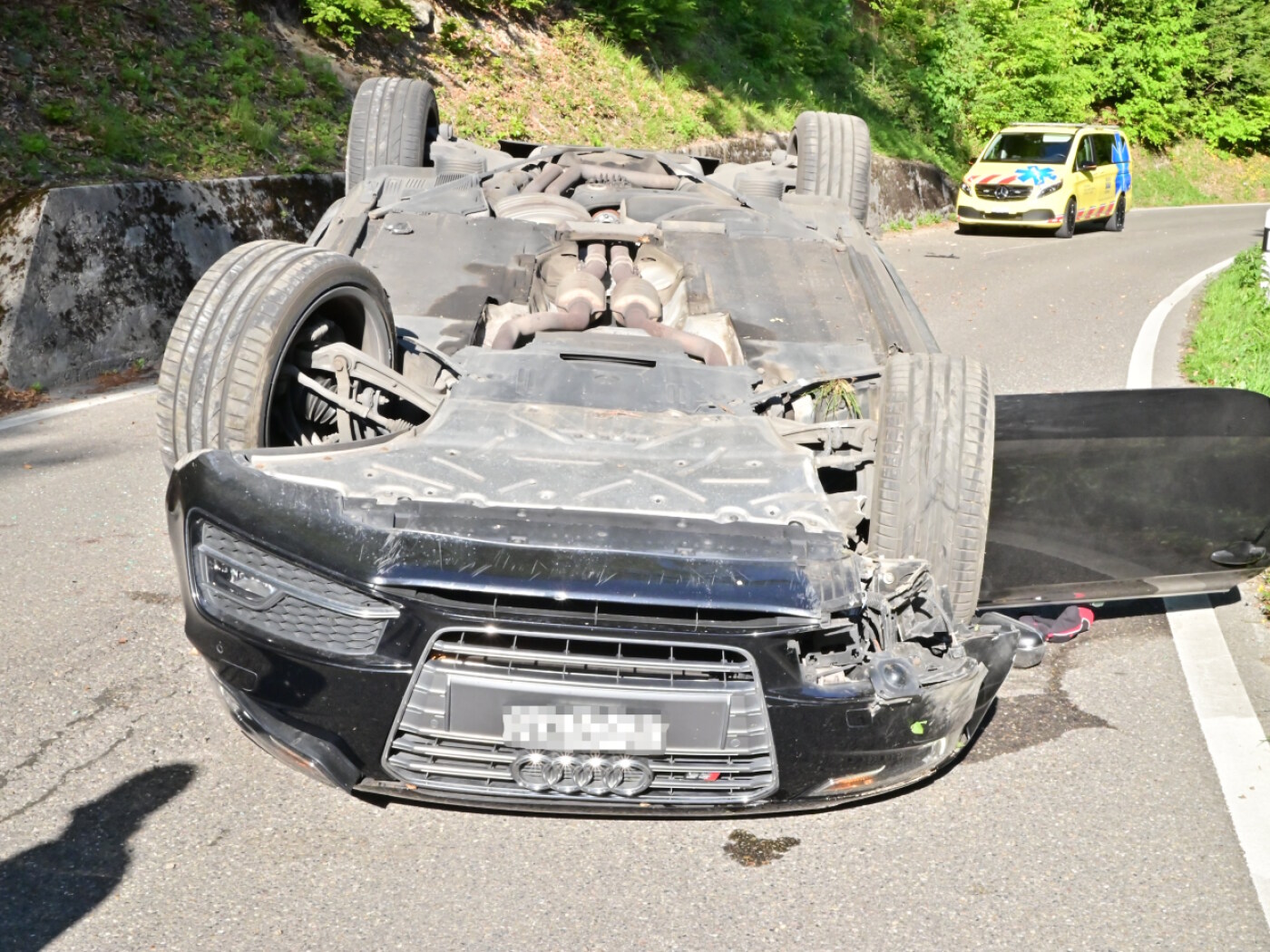 (Keystone-SDA) Der 47-jährige Lenker geriete um 17.10 Uhr von der Fahrbahn ab und fuhr über eine Böschung. Das Auto schleuderte über eine Stützmauer und kam in der Mitte der Strasse auf dem Dach liegend zum Stillstand. Der Mitfahrer wurde «eher schwer verletzt», der Lenker unbestimmt verletzt, wie es im Communiqué heisst.