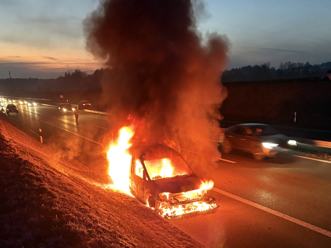 Auf der Autobahn A7 bei Wigoltingen TG ist am Donnerstagabend ein Auto komplett ausgebrannt. Die Feuerwehr löschte den Brand. Verletzt wurde gemäss der Polizei niemand.
