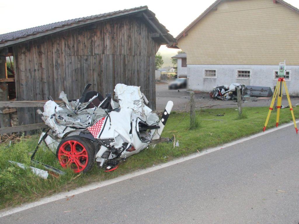 Das Auto kam in der Folge links von der Strasse ab, durchfuhr ein Feld und prallte so heftig gegen den Metallpfahl einer Scheunenecke, dass es in zwei Teile gerissen wurde. Während der hintere Teil des Fahrzeugs in die Nähe der Strasse katapultiert wurde, schleuderte der vordere Teil mit den beiden Insassen weiter in Richtung eines Landwirtschaftsgebäudes. Dort prallte der Fahrzeugteil gegen zwei Traktormulden, die vor dem Gebäude abgestellt waren. Dabei wurde der Lenker aus dem Fahrzeugwrack heftig gegen die Fassade des Gebäudes geschleudert.