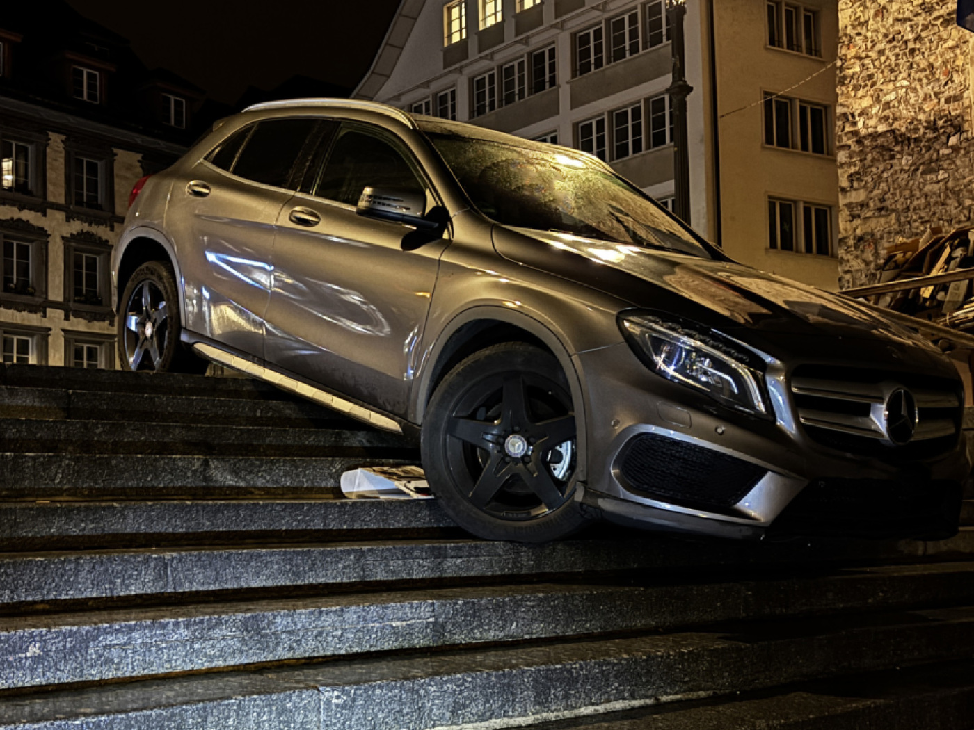 Ein 47-jähriger Mann ist in der Nacht auf Dienstag mit einem Mietauto auf der Rathaustreppe in der Luzerner Altstadt stecken geblieben. Das Navigationssystem habe ihn dorthin geführt, sagte er gemäss der Polizei aus.