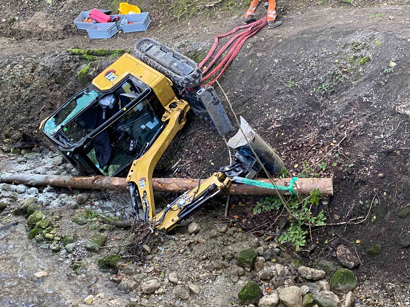 Bagger stürzt in Allenwinden ZG in Bach und verletzt Fahrer