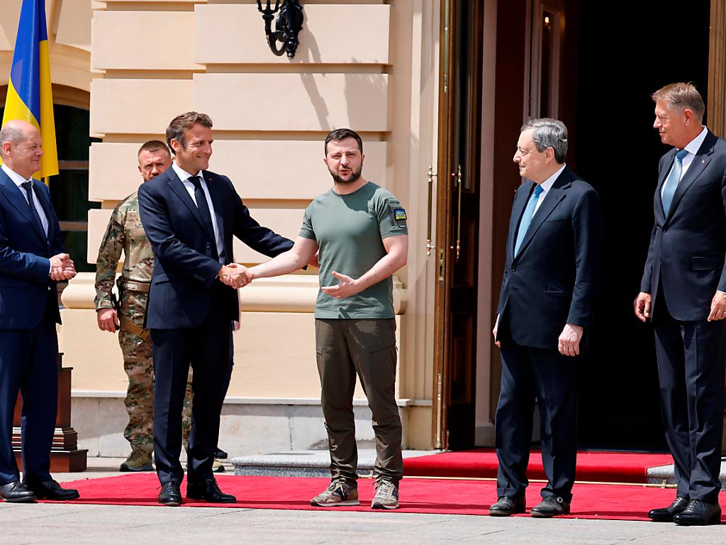 Gemeinsam mit Scholz waren unter anderem auch Frankreichs Präsident Emmanuel Macron und der italienische Ministerpräsident Mario Draghi in der Hauptstadt. Schon nach ihrer Ankunft am Morgen hatte es einen Luftalarm gegeben.