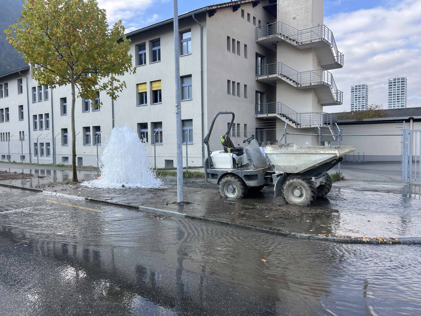 In Chur hat eine Wasserfontäne aus einem beschädigten Hydranten am Freitagvormittag die angrenzenden Flächen überflutet. Einsatzkräfte stellten daraufhin die Wasserzufuhr ab, wodurch die Truppenunterkunft des Militärs für einige Zeit kein Wasser hatte.