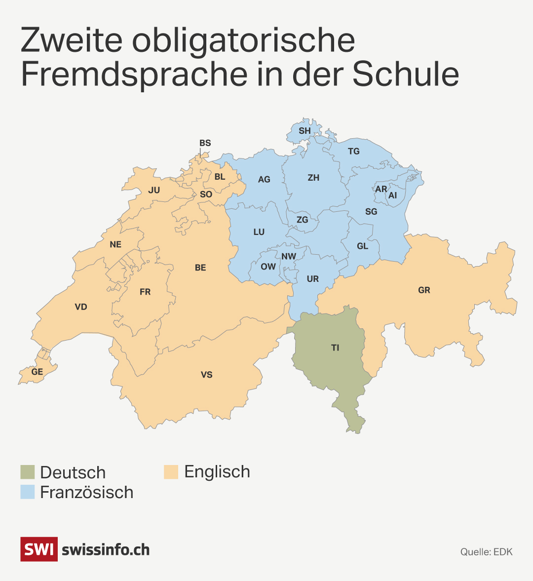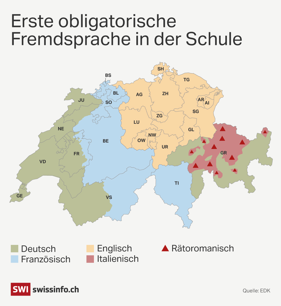 In den meisten deutschsprachigen Kantonen wird in der Schule zuerst Englisch eingeführt, danach Französisch. In den französischsprachigen Regionen dagegen lernen die Kinder zuerst Deutsch – die Tendenz laufe sogar eher zu mehr Deutschunterricht, wie der Westschweiz-Korrespondent von SRF festhältExterner Link.
