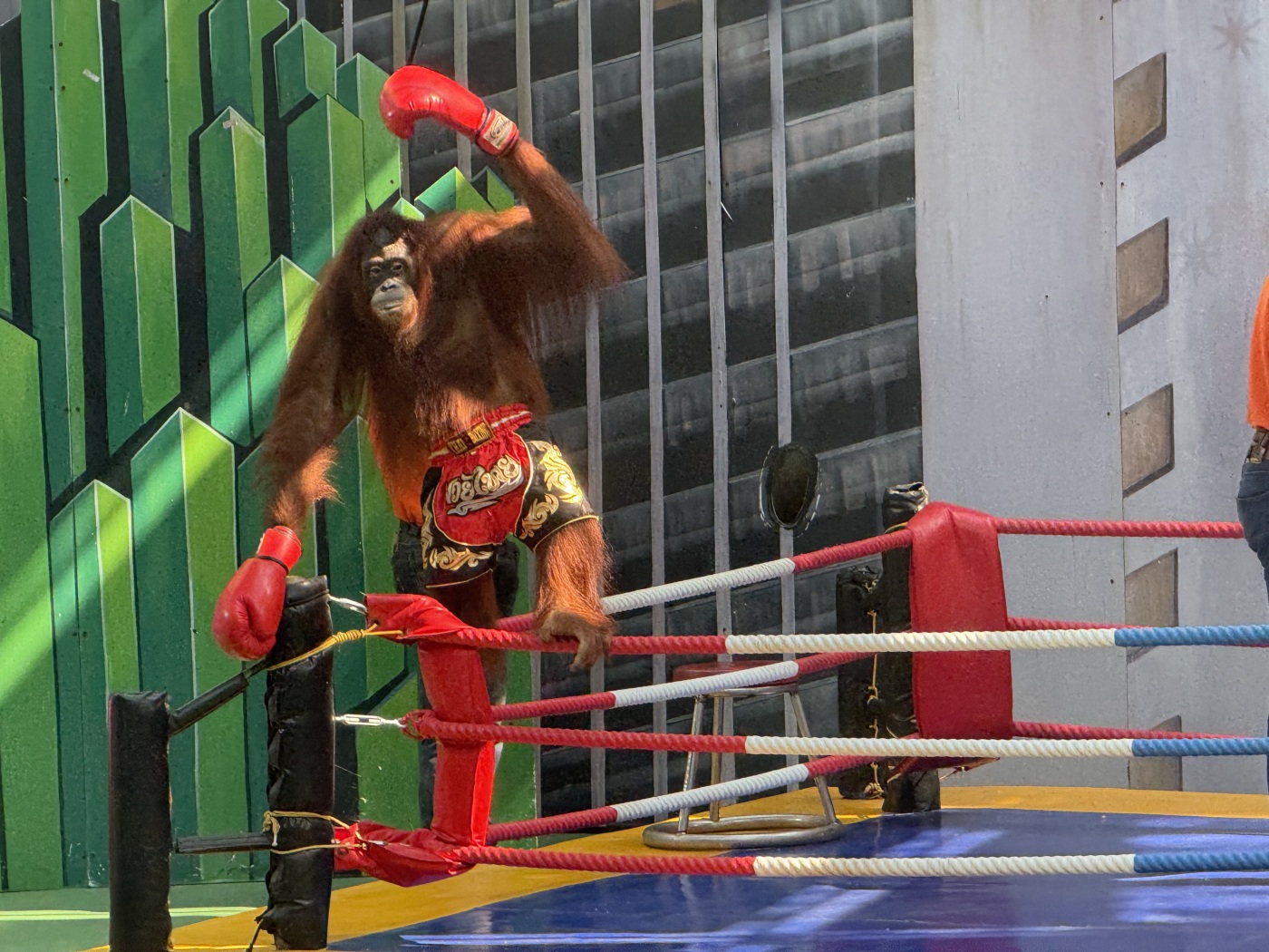 Zwei Orang-Utans tapsen in engen Sporthosen und Boxhandschuhen in den Ring, angefeuert von Animateuren. Die Menschenaffen schlagen einstudierte Haken, werfen sich theatralisch zu Boden. Schliesslich reisst der vermeintliche Sieger die Arme in die Höhe. Aber Sieger sind hier nur die Betreiber, bei denen jeden Tag die Kasse klingelt.
