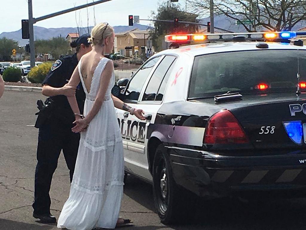Die 32-Jährige habe offenbar unter der Einwirkung von Alkohol oder Drogen gestanden und sei in Marana im Süden des US-Staates Arizona in einen Unfall verwickelt gewesen, zitierte der TV-Sender ABC die Polizei am Montag (Ortszeit). Beamte eilten zum Unfallort und nahmen sie fest. Auf Fotos ist zu sehen, wie die Braut in Handschellen zu einem Polizeiauto gebracht wird.