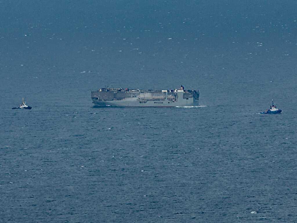 Es war ein riskantes Unternehmen, denn das Schiff mit rund 3800 Autos an Bord brennt noch immer. Das Feuer sei aber deutlich schwächer geworden, hiess es. Befürchtet wurde, dass es Risse in den Stahlwänden geben und Öl ausströmen könnte. Beim Auseinanderbrechen oder Kentern des Schiffes droht eine Umweltverseuchung.