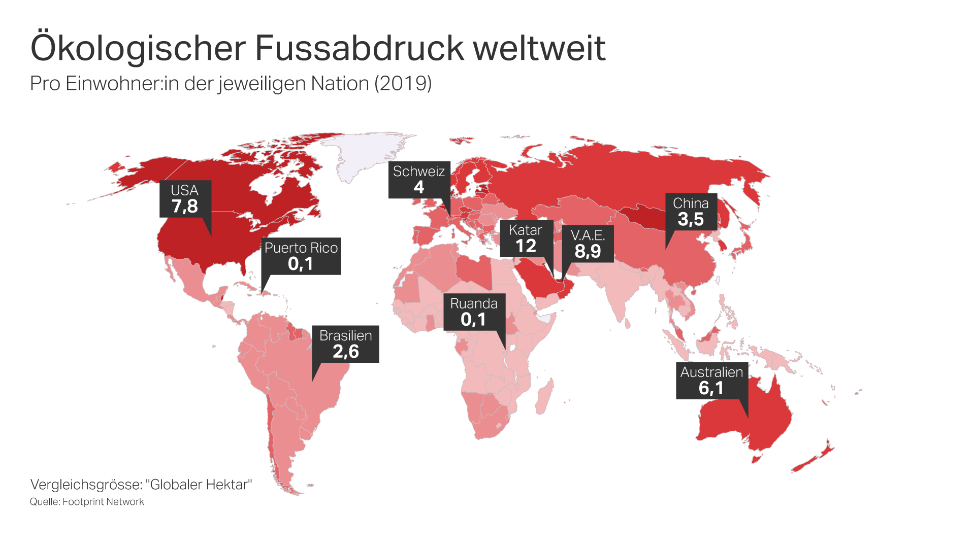 Wie weit wir planetare Grenzen überschritten haben, kann man mit dem ökologischen Fussabdruck darstellen. Dieser lässt einzelne Länder leichter miteinander vergleichen. Die Zahlen sind quasi die Grösse des Fussabdrucks eines Einwohners, gemessen in «globalem Hektar». Dieser wiederum beschreibt Fläche, die ein Mensch für seinen Lebensstil braucht.