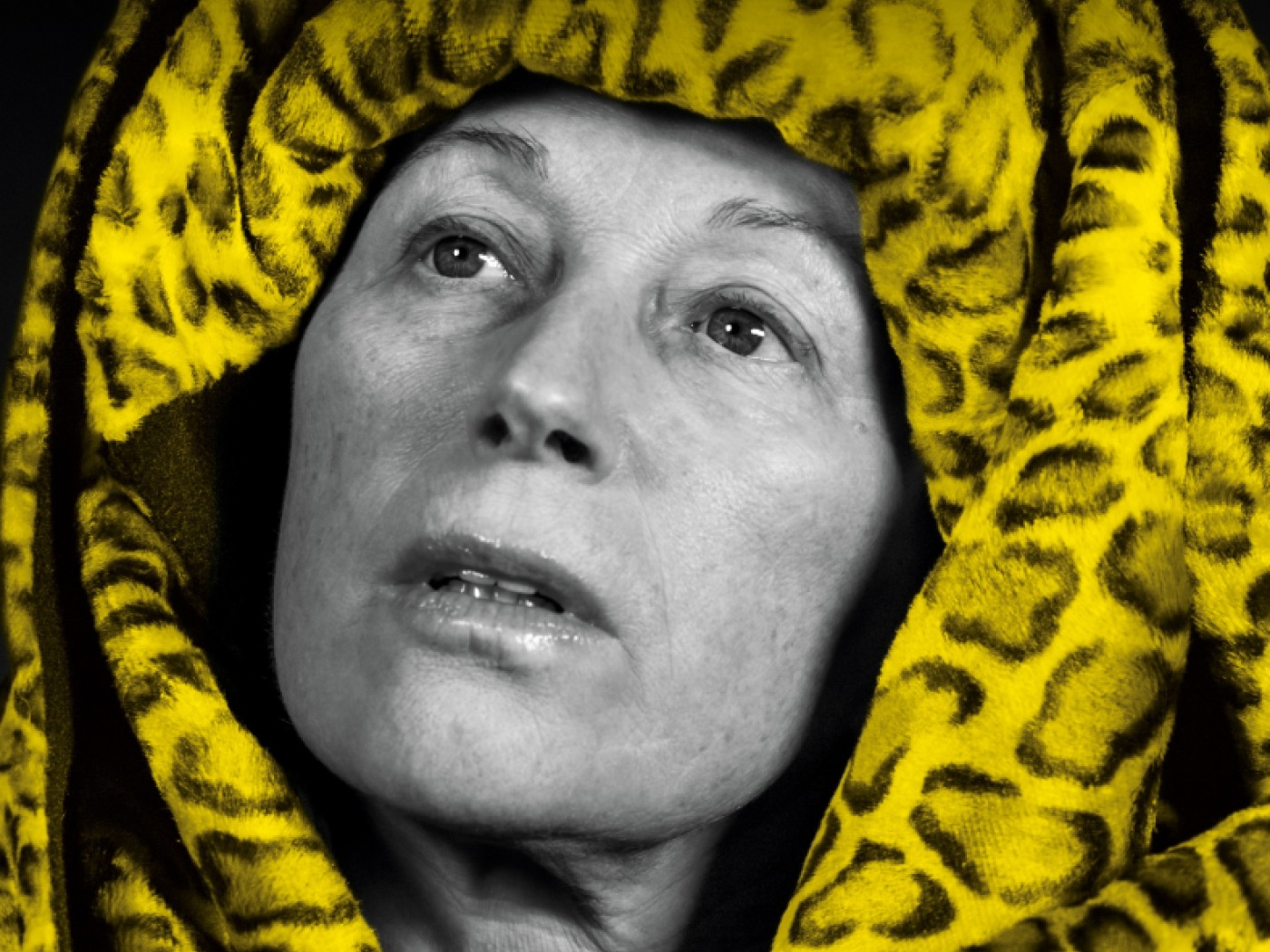 (Keystone-SDA) Das Porträt einer Frau in schwarz-weiss, den Blick schräg nach oben gerichtet; umhüllt ist dieses Frauengesicht von einem Schal mit Leopardenmuster in kräftigem gelb-schwarz. Der Schal lässt nur das Gesicht und den Hals unbedeckt, die Haare sind verborgen.