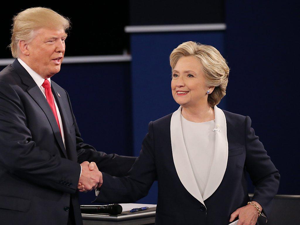 In den knapp 90 Minuten zuvor hatten sich die beiden nichts geschenkt. Der Republikaner Trump, zuletzt wegen sexistischer Äusserungen im Jahr 2005 in die Defensive geraten, forderte sogar Haft für seine Gegnerin wegen ihres Umgangs mit ihren dienstlichen E-Mails als US-Aussenministerin. Die Demokratin Clinton bezichtigte Trump ihrerseits mehrmals, falsche Angaben zu machen. «Was Sie von Donald hören, ist wieder nicht wahr. Er lebt in einer parallelen Realität», sagte Clinton.