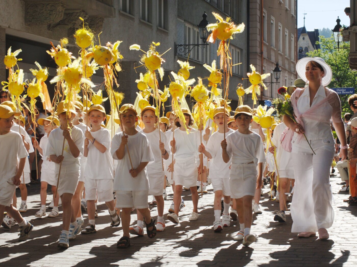Der erste Programmpunkt ist der Umzug der Schulklassen bis zum Festplatz. Die Strassen und Gassen sind umsäumt von Zuschauerinnen und Zuschauern. Manchen Lehrerinnen und Lehrern kommt der Weg wie ein Spiessrutenlauf vor. Nette oder eher hämische Kommentare aus dem Publikum über Kleidung und Auftritt sind oft unüberhörbar.