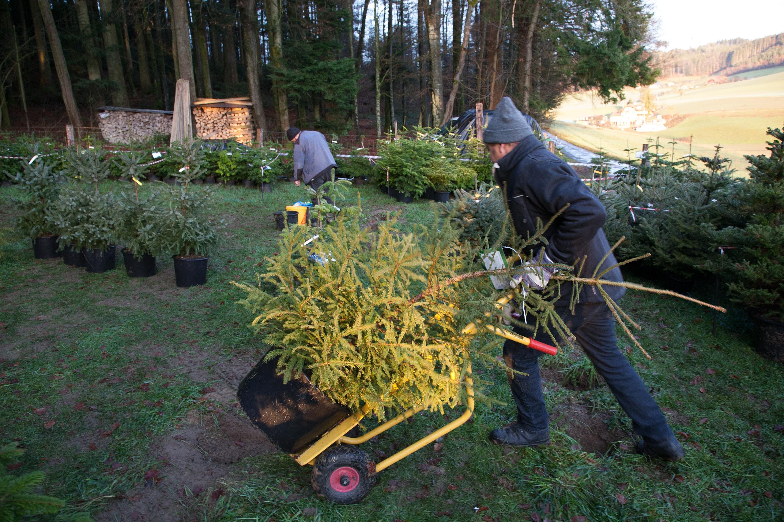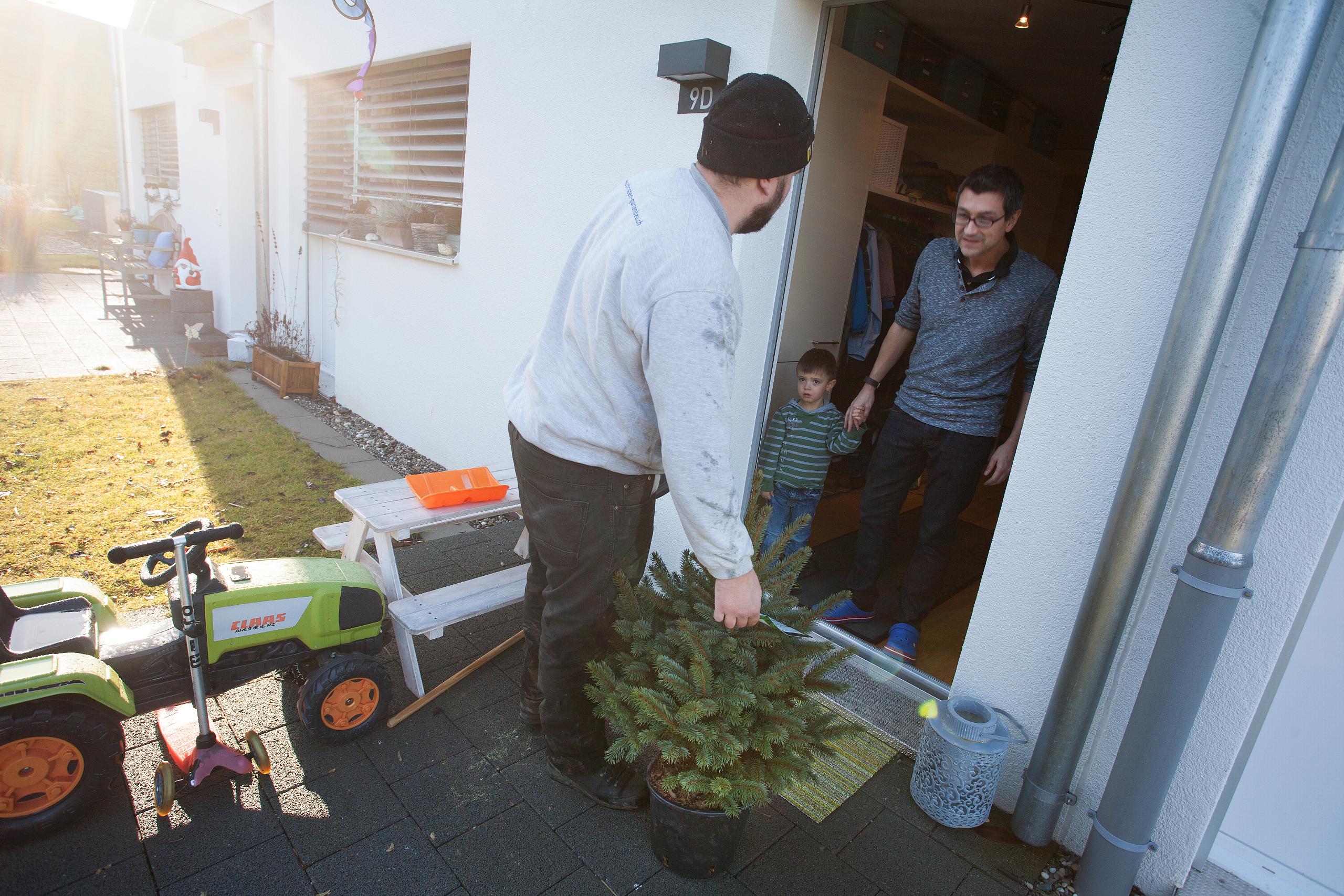 Michael Christen, der im Kanton Bern ein Gartenzentrum betreibt, und sein Bruder Adrian, ein Förster, vermieten Weihnachtsbäume. Kunden können den Tannenbaum online bestellen. Zur Auswahl stehen fünf Sorten. Die beiden liefern, pflanzen und holen die kleine Tanne nach den Festtagen wieder ab. swissinfo.ch begleitete Michael und dessen Vater bei den festlichen Lieferungen.