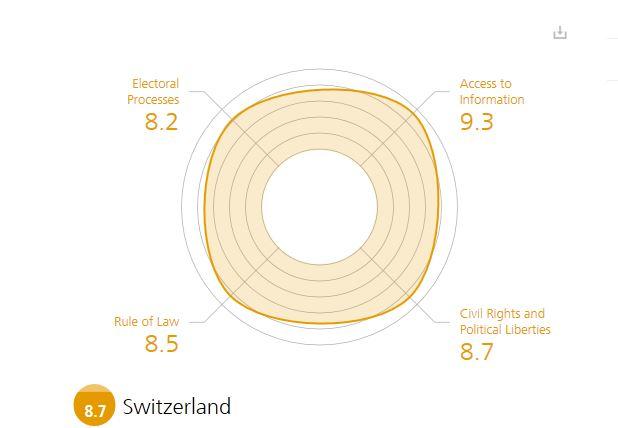 Das Punktetotal holt sich die Schweiz in drei weiteren Demokratie-Bereichen: der Fairness für eingeschriebene Kandidierende und Parteien bei Wahlen, dem Wahlprozess für die Bürgerinnen und Bürger sowie dem Zugang zu Informationen.