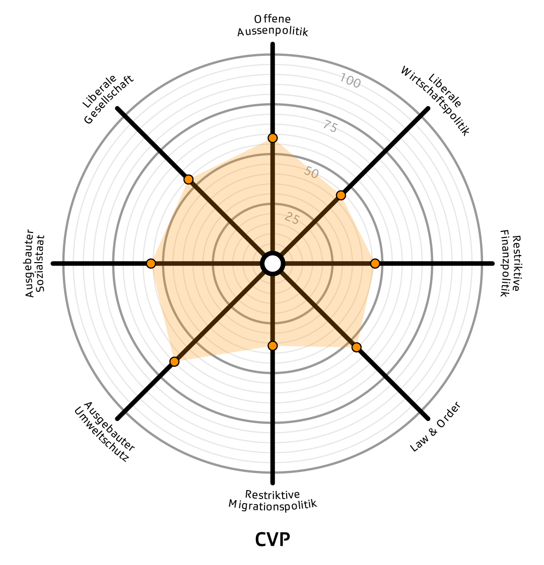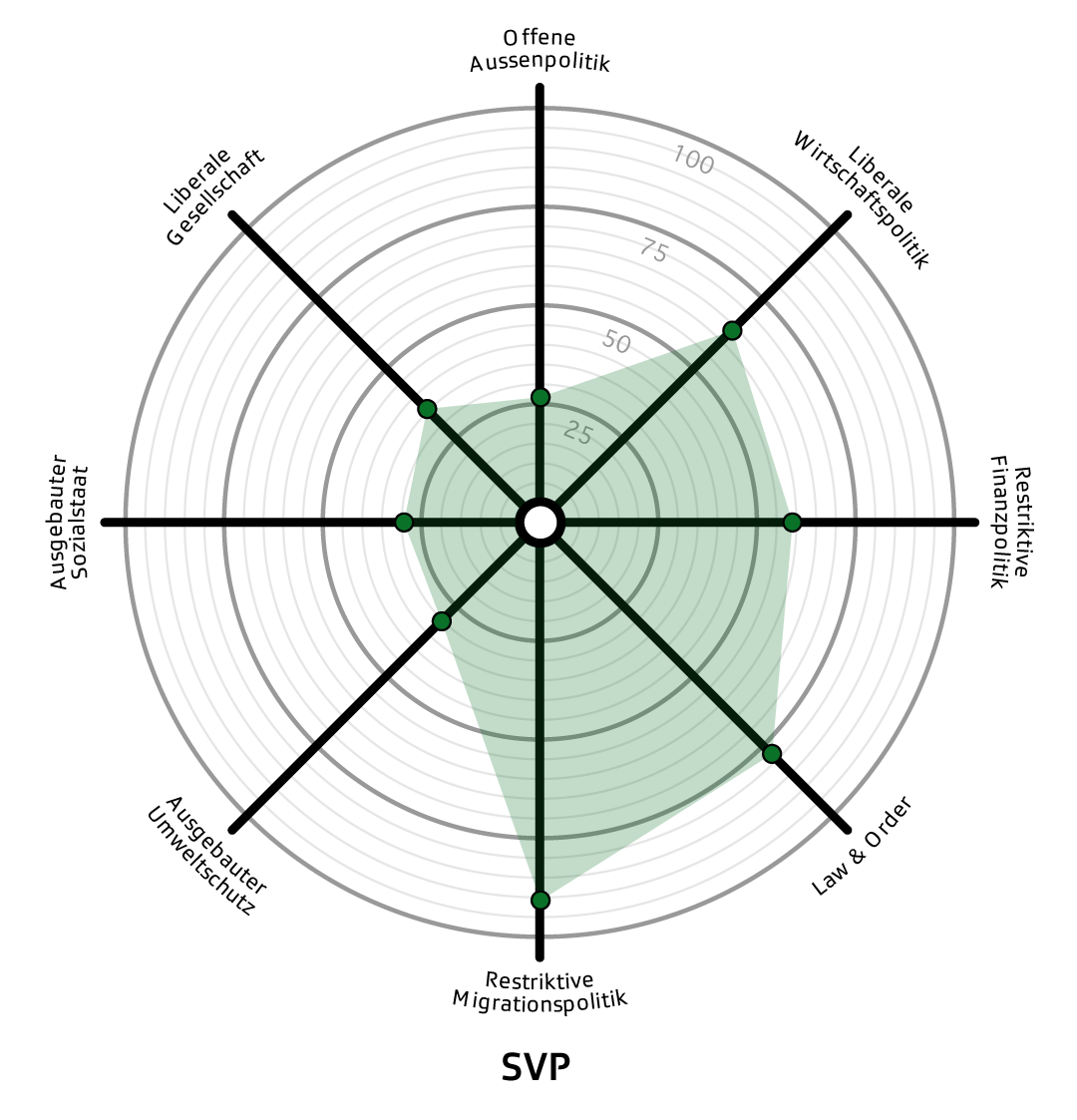 Die Skalierung für jede Achse des Diagramms reicht von einem Minimum von 0 bis zu einem Maximum von 100. Je höher der Wert, desto stärker ist die Unterstützung der Partei für das dargestellte Ziel.