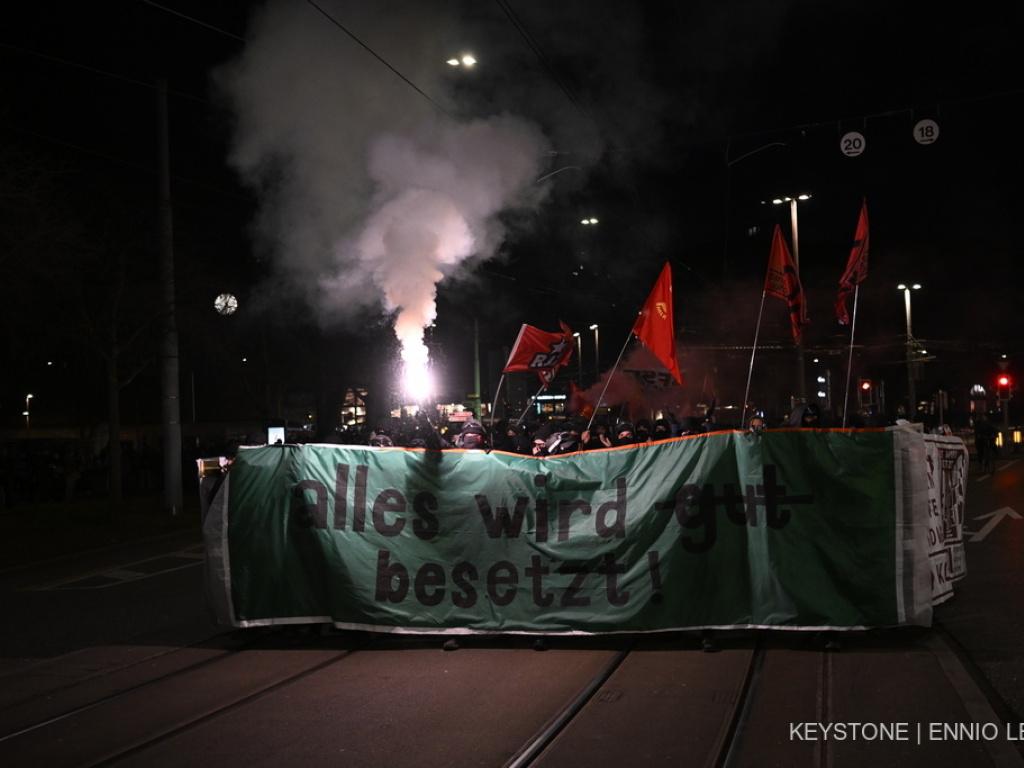 Die Besetzerszene hatte sich ab 18 Uhr vor dem Landesmuseum in der Nähe des Hauptbahnhofs versammelt. Auf Transparenten war «Wohnruum für all suscht gits Krawall», «Miethaie enteignen» und Hüser bsetze, Bonze schletze» zu lesen. Fahnen der Revolutionären Jugend Zürich waren ebenso zu sehen wie Hammer und Sichel.