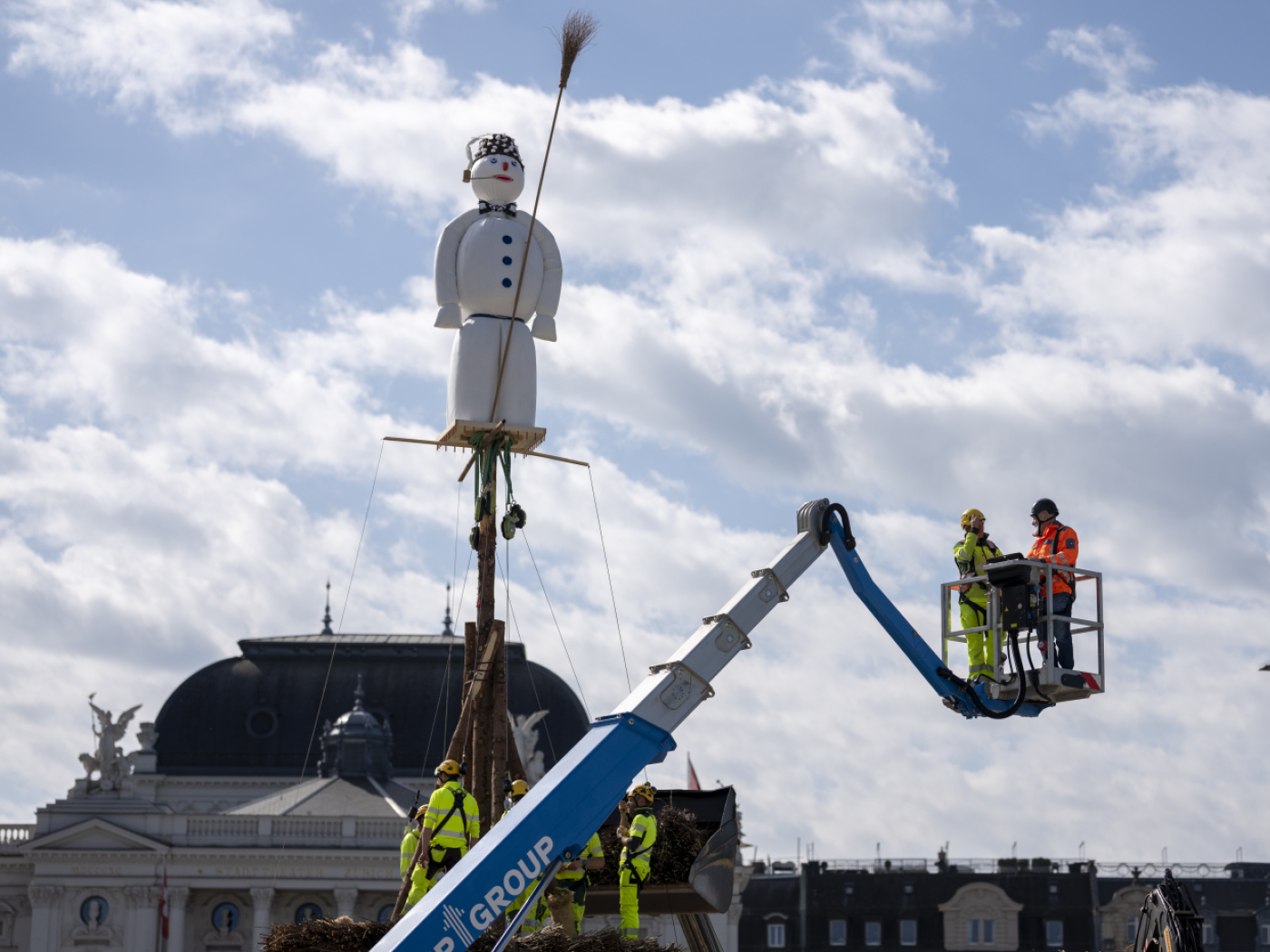 Unter dem Schneemann auf dem Sechseläutenplatz wird der grosse Holzstoss errichtet. Ab 18 Uhr sollen dann die Flammen lodern. Der Böögg trägt eine Fliege mit Steinbockmotiv, die an den Gastkanton Graubünden erinnert.